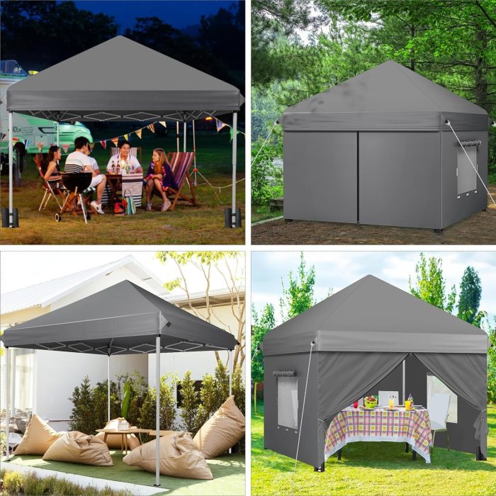- 3 x 3m Pop-Up Gazebo with Sides – This gazebo offers a spacious 9 square meter shaded area, comfortably accommodating 8-10 people. It features adjustable height settings of 265 cm, 275 cm, and 310 cm.