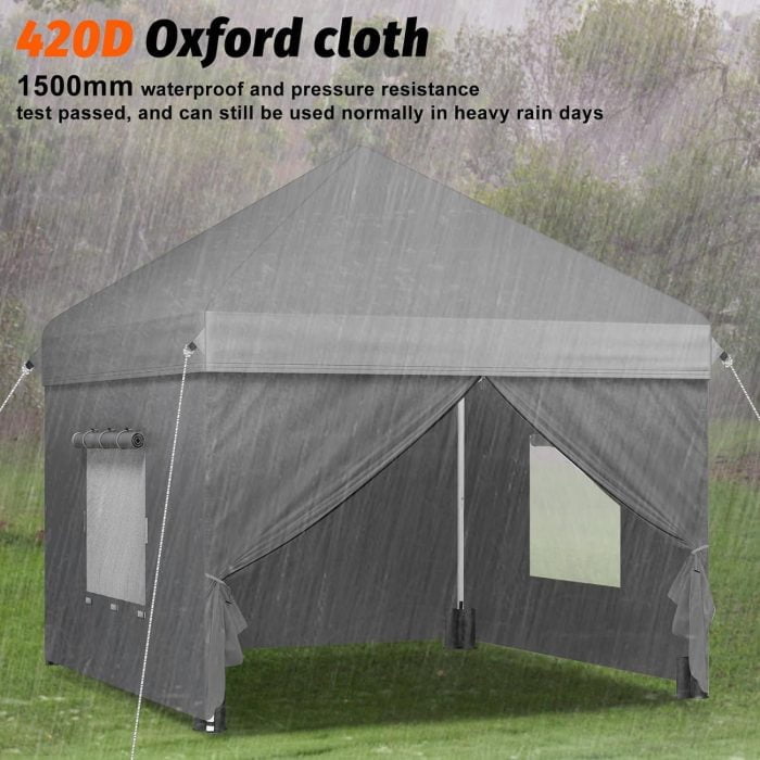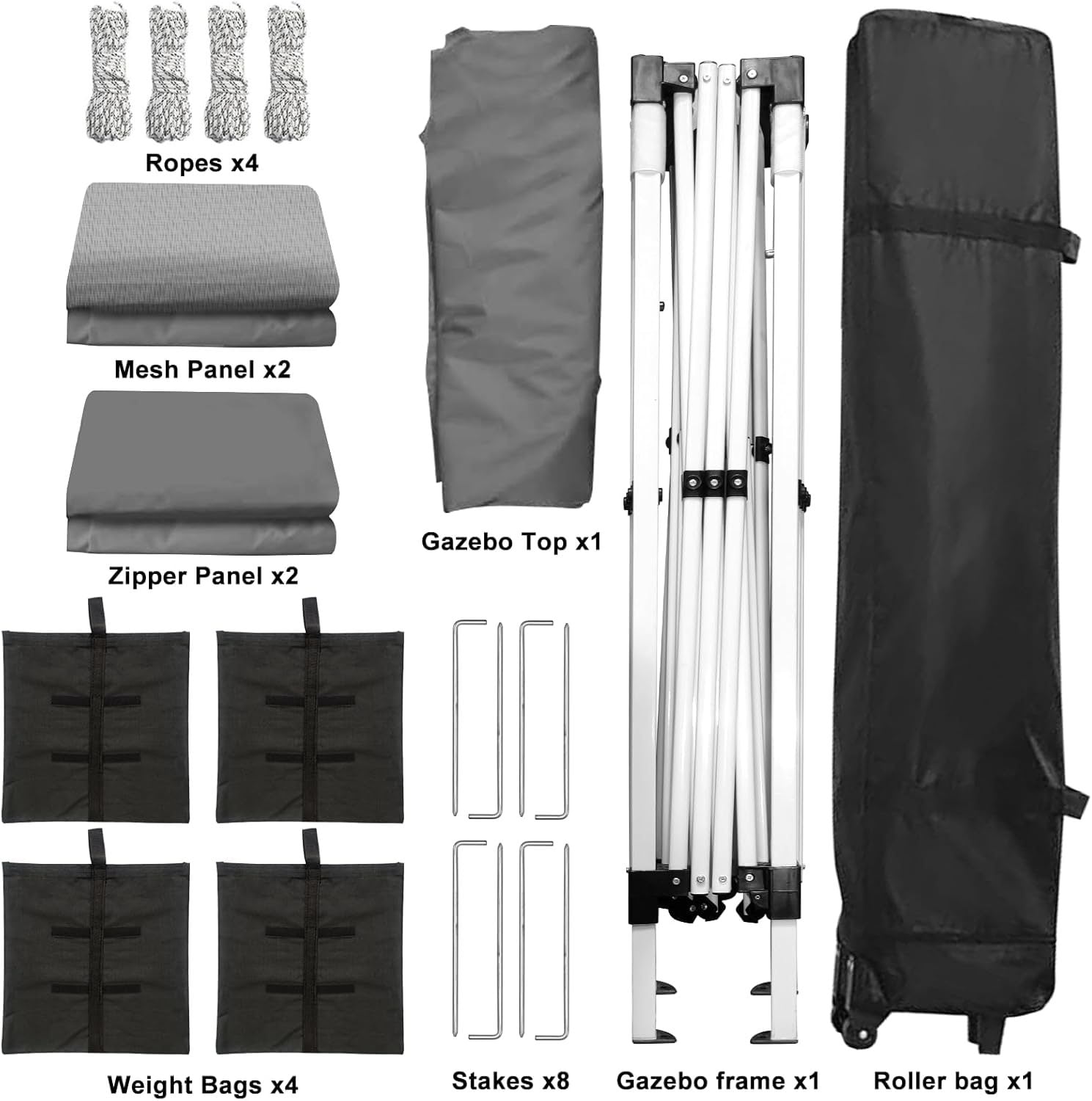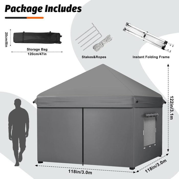 - Complete Package – Includes 1 gazebo, 4 side walls (2 with windows), a 420D Oxford carrying bag with wheels, 8 ground pegs, and 4 sandbags.