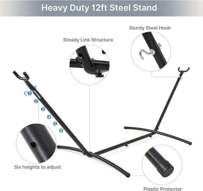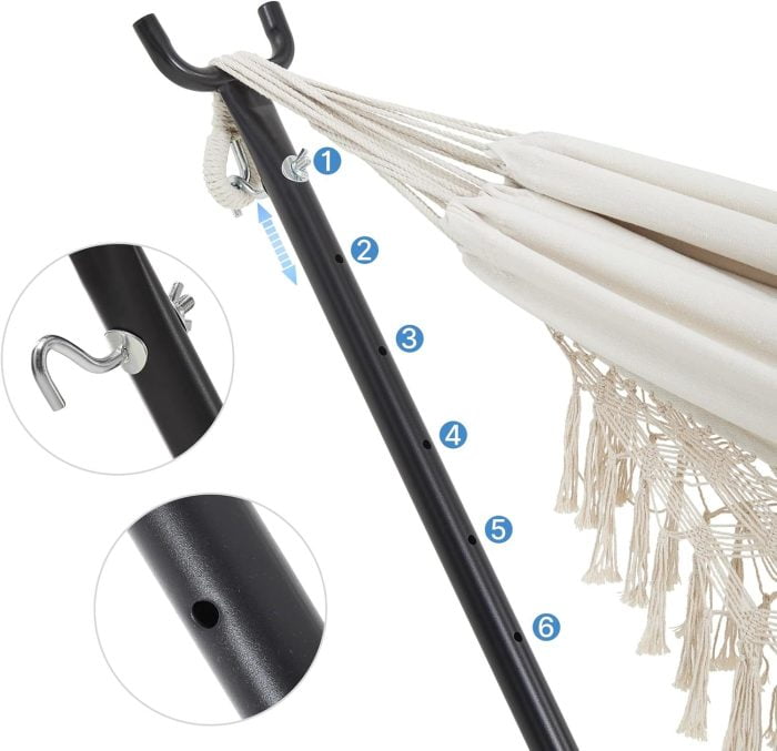 - Adjustable Hooks: Six evenly spaced holes on each hammock stand allow you to adjust the hook position for your desired height.