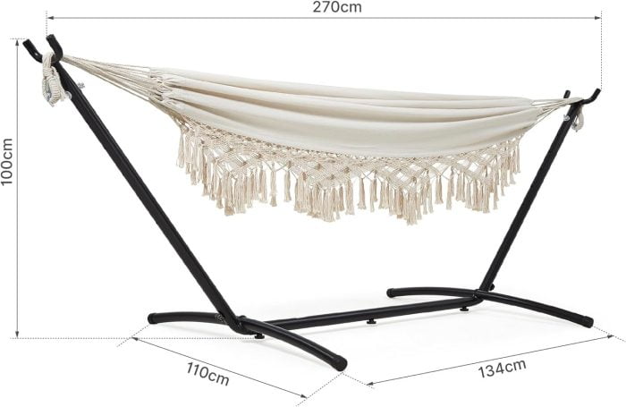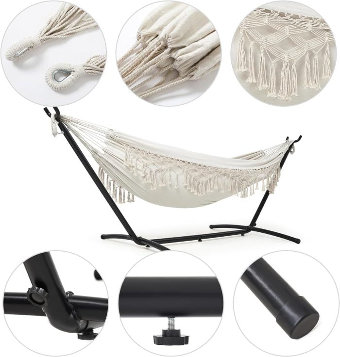 - Exquisite Bohemian Design: This elegant hammock features beautiful tassel detailing, handwoven with a six-strand blend of 65% cotton, 30% polyester, and 5% other fibers, ensuring breathability and comfort.Adjustable Height: Enjoy a personalized experience with six adjustable positions on the hammock stand for maximum comfort.Sturdy and Durable: Equipped with special knotting straps for enhanced strength and stability, along with non-slip feet to keep the hammock securely in place.