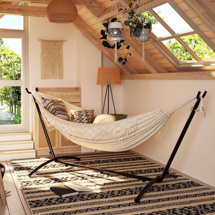 This Bohemian Cotton Hammock is an ideal alternative to traditional hammocks as it doesn’t require large trees for hanging. Suitable for beach, patio, bedroom, courtyard, balcony, and both indoor and outdoor spaces, it offers a joyous relaxation spot for family and friends and a great place for reading. The Bohemian-style hammock complements most decorative styles, adding a touch of elegance to any setting.