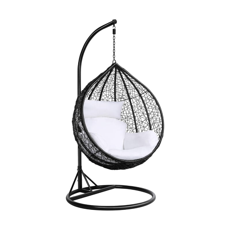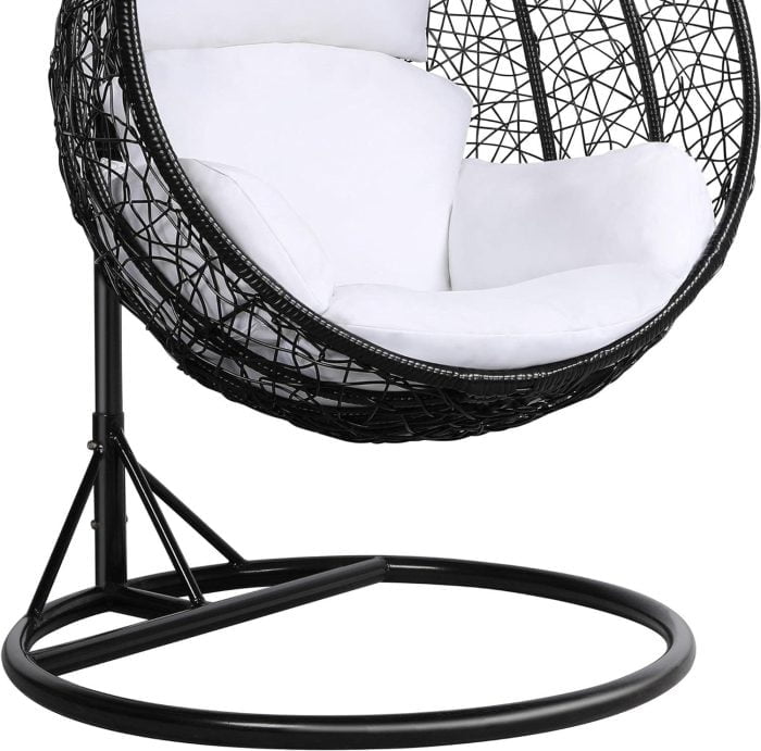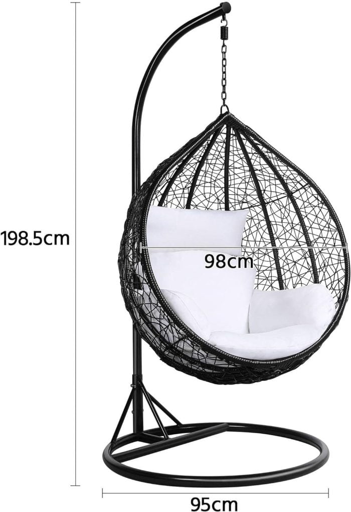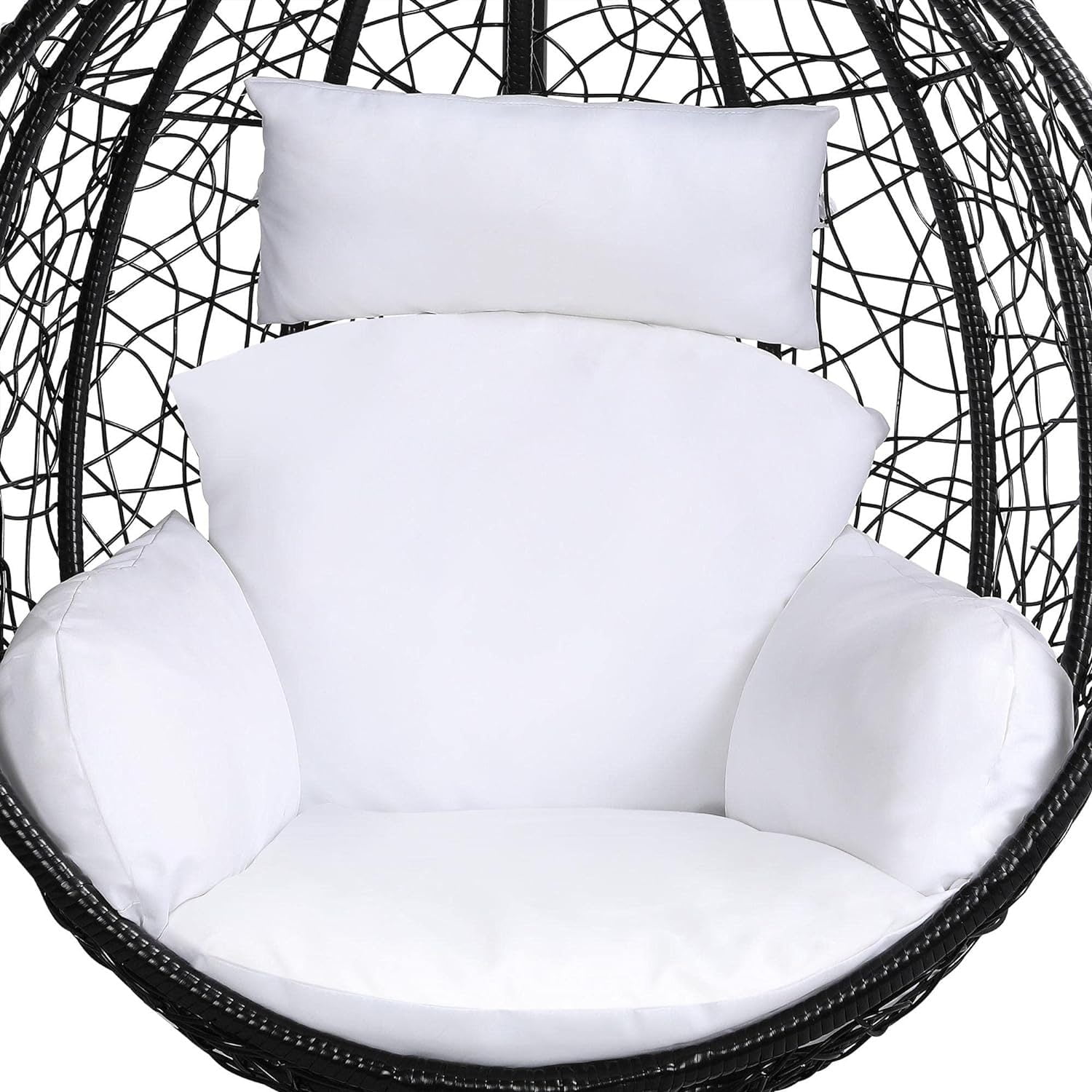 - turdy and Durable: This rattan swing chair is crafted from high-quality PE and iron materials, ensuring sturdiness and durability. It features corrosion resistance, great flexibility, and no fading, even under the sun and rain, offering an extended service life.Comfortable to Sit: The egg swing chair comes with a soft cushion for high comfort, helping you relax. The design is tested to fit the curve of the human body, reducing fatigue.Adorable Egg Shape: The egg shape design adds charm and vitality to any space, making the rattan swing chair more appealing.